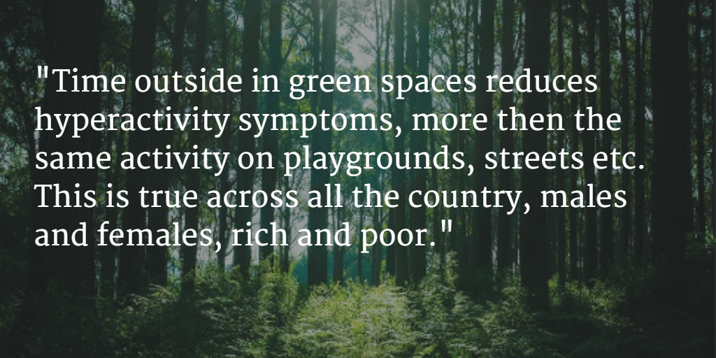 Continuing on my theme of enjoying the advent of Spring after a long winter - Time outside in green spaces reduces hyperactivity symptoms, more then the same activity on playgrounds, streets etc. This is true across all the country, males and females, rich and poor.